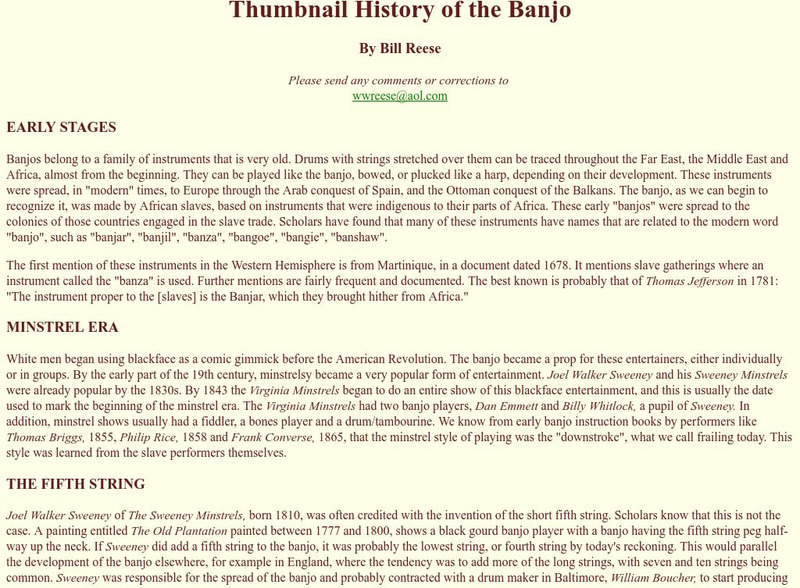 Site that focuses on the development of the banjo instrument, but also traces its role in minstrel shows of the 1800s. Offers different viewpoint of this genre.