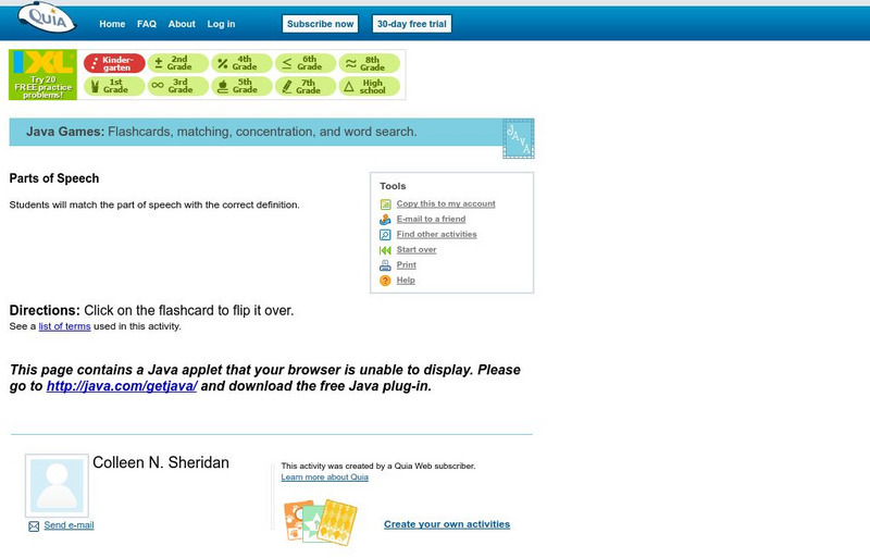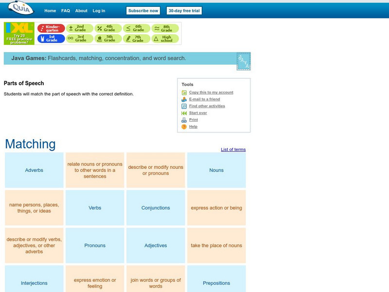 Use this tutorial to practice remembering the parts of speech and their definitions using a matching game format.