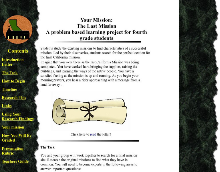 This PBL unit has learners research existing California missions to find what they have in common looking at geography, native people, natural resources. Then, using their information, students work in groups to create their own final...