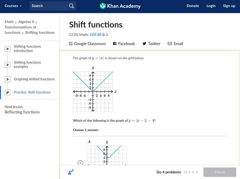 Shift functions horizontally and vertically, and practice the relationship between the graphical and the algebraic representations of those shifts. Students receive immediate feedback and have the opportunity to try questions repeatedly,...