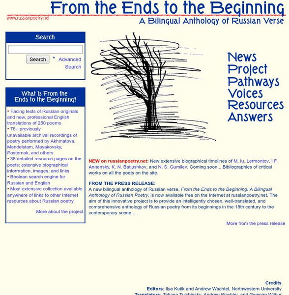 Nice collection of several hundred Russian poems, reaching back into the eighteenth century and moving forward from there. Read or listen to selections in Russian or English by searching by poem or poet. You'll also find biographical...