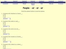 In this er, or, and ar worksheet, students fill in the end of the word for the person described. Students complete 20 multiple choice questions.