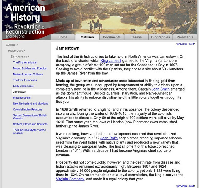 A comprehensive history of the colony of Jamestown, Virginia. Includes a very nice timeline and historical background.