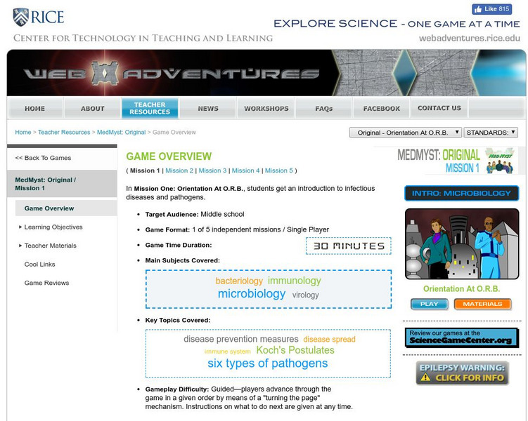 In this online learning adventure game, students get an introduction to infectious diseases, pathogens and the immune system. They will conduct field and laboratory investigations to solve the problem they are given, while playing the...