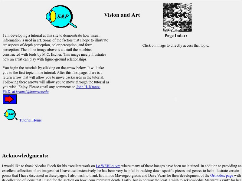This site from Hanover College gives a tutorial on issues of visual representation, such as depth, perspective, texture, shadow, illusion. Begins at an introductory level. Numerous pictures.
