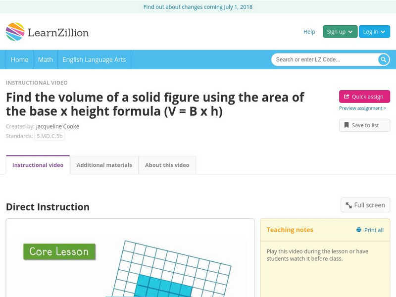 Learn Zillion: Find Volume of a Solid Figure Using Area of Base X Height Formula