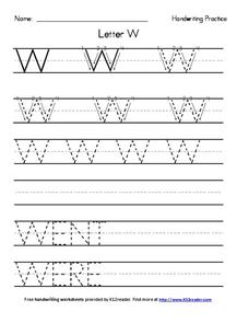 In this upper case W worksheet, students trace and write the lower case letter W and W words. Students trace and write 6 lines on this worksheet.