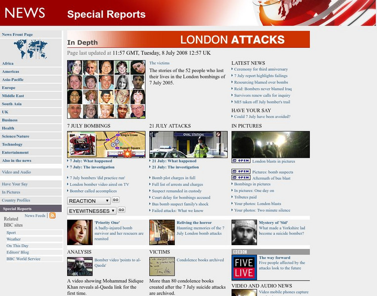 BBC News in-depth coverage of the London Attacks on 7/7/2005. You will find eyewitness accounts, reaction from around the world, and video accounts.