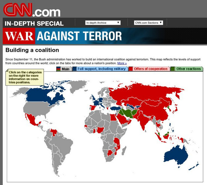 A map that depicts all of the countries in the world that provided support after the September 11, 2001 attacks on the USA. It also shows the countries that decided not to support militarily, but who would provide other assistance, and...