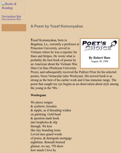 Robert Hass, former U.S. Poet Laureate, reviews Yusef Komunyakaa in "The Poet's Corner" for the Washington Post. Komunyakaa's poem "Woebegone" is featured.
