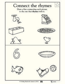 Introduce your pre-readers to rhyming using this matching exercise! They examine two sets of images, connecting rhyming pictures with a line. All 10 words use the vowel sound i. Note that some of these images may be difficult for...