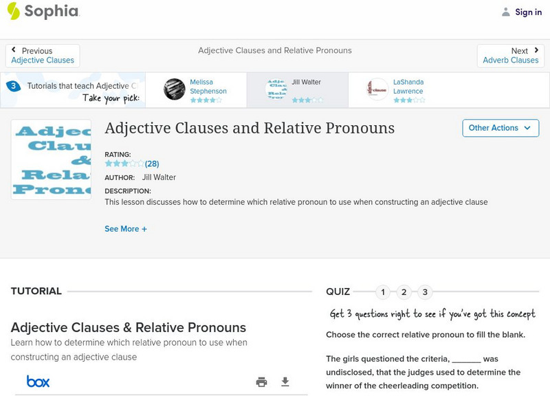 This lesson discusses how to determine which relative pronoun to use when constructing an adjective clause. This tutorial lesson shares a short slideshow and review questions over the lesson's content.