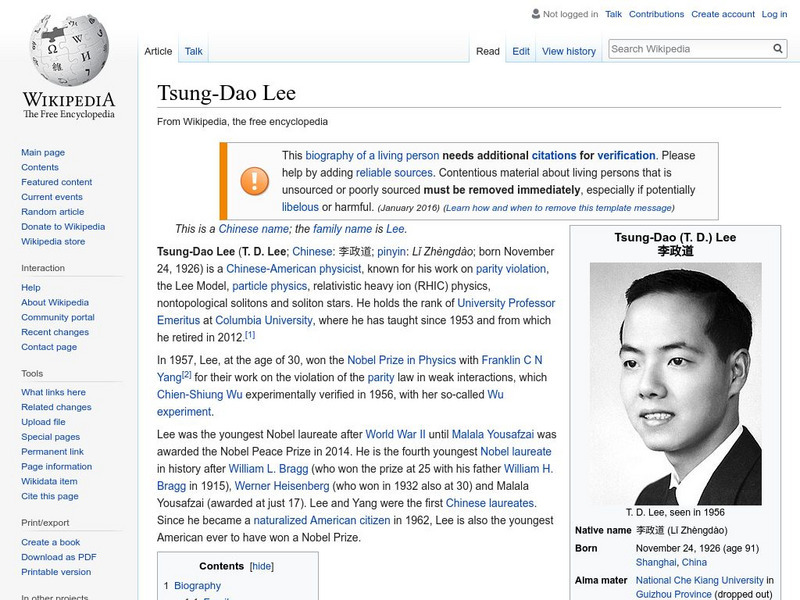 Wikipedia provides biographical information on Tsung-Dao Lee, a Chinese-American physicist who recieved the Nobel Prize at the age of thirty-one.