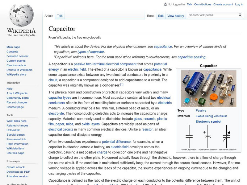 Wikipedia offers detailed information on capacitors, including a hyperlinked table of contents for easy site navigation.