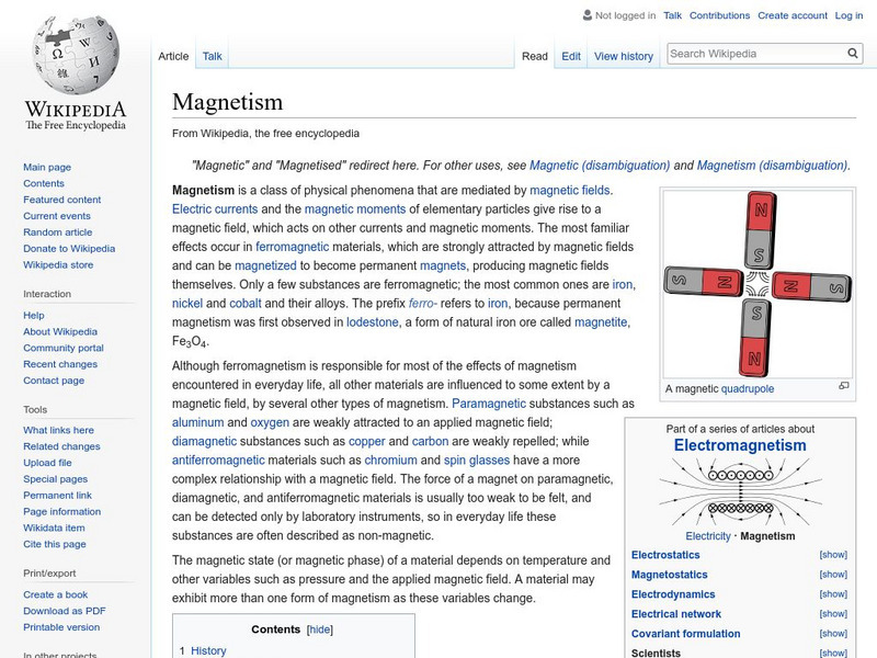 Detailed information on magnetism, a physics phenomenon. Page includes a hyperlinked table of contents for easy navigation. Wikipedia is an online wiki, popular (not scholarly) in nature.