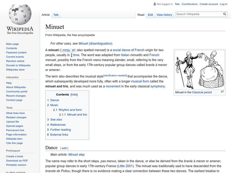 Wikipedia offers an excellent definition of the minuet, a dance for 2 persons in 3/4 time. Includes many hyperlinked terms.