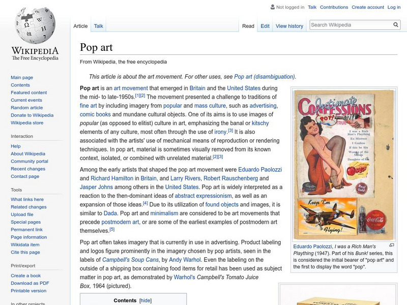 Wikipedia offers information on this art genre and the artists of the pop art artistic movement. Includes hyperlinks to the different artists.