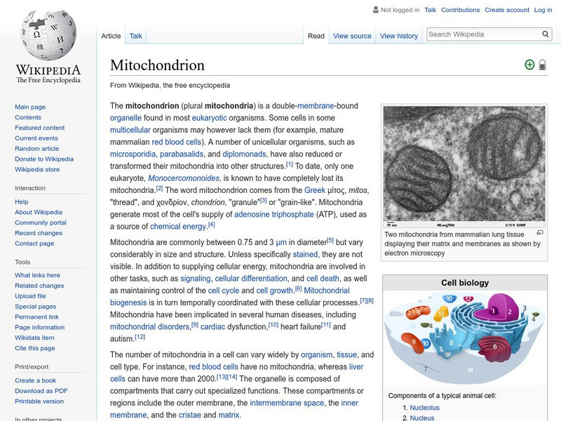 This encyclopedia article from Wikipedia on mitochondrion describes its function, structure, the energy conversion process, and its use in genetic studies. An illustration is also provided.