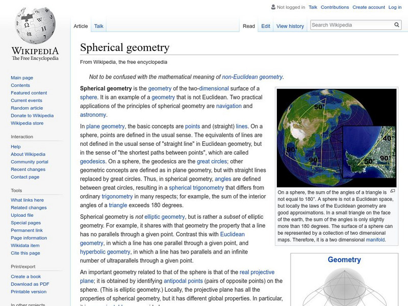 Wikipedia, a publicly-maintained encyclopedia, provides an explanation of spherical geometry along with a listing of its most important uses.