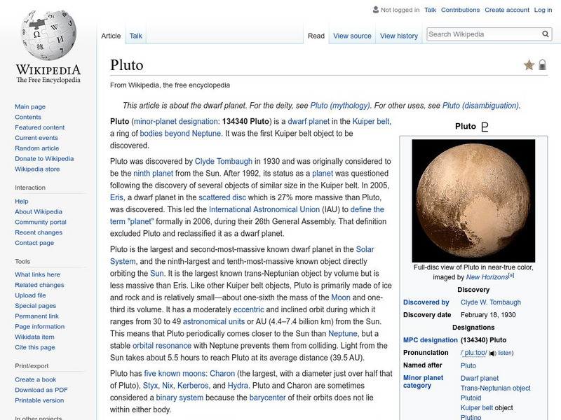 Wikipedia, a publicly-maintained encyclopedia, provides an article on the dwarf planet, Pluto, including images, physical characteristics, history of its naming, the planet/dwarf planet debate, and more.