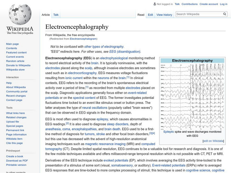 This Wikipedia Encyclopedia entry provides a brief explanation of an electroencephalogram test, (EEG). Includes information on the EEG's discovery and use.
