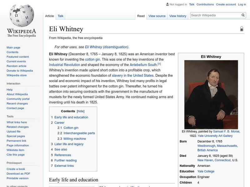 This Wikipedia online encyclopedia site offers a brief biography of Eli Whitney (1765-1825 CE), inventor of the cotton gin and many other things. The encyclopedia entry provides many hyperlinks to terms as well as an illustration of...