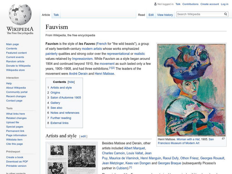 A brief encyclopedia article from Wikipedia describing the Fauvism art movement and listing the artists associated with the movement.