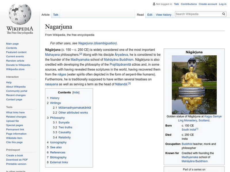 Wikipedia, a publically-maintained wiki, provides biographical information on Nagarjuna, Indian philospher and founder of Mahayana Buddhism.