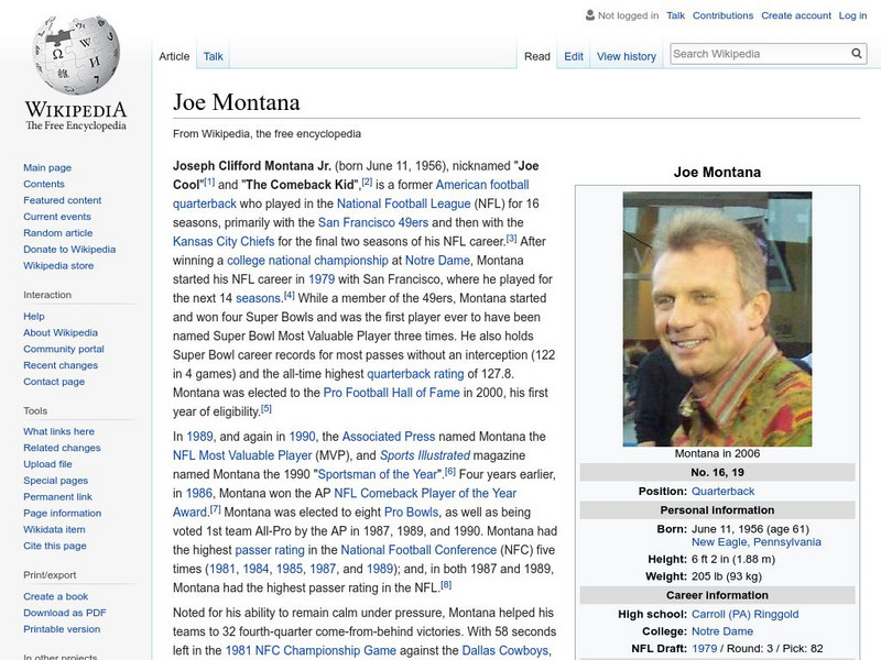 Wikipedia provides biographical information about Joe Montana, including his football statistics from high school, college, and the pros.