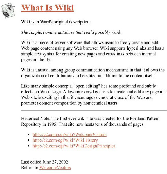 Very short page that briefly defines the term "Wiki," and gives a description of its use. Links to additional information are available as well.