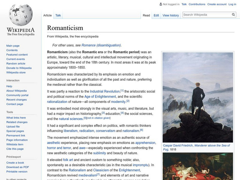 Wikipedia provides a detailed site on Romanticism, an artistic and intellectual movement in the late 18th century. This site includes several examples of artwork from the Romantic era.
