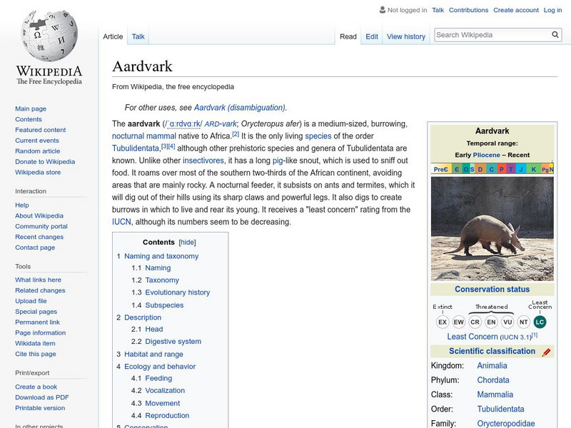 This encyclopedia article from Wikipedia provides a brief overview of the aardvark. Additional content includes a focus on "aardvark" as a subject of humor in British comedy.