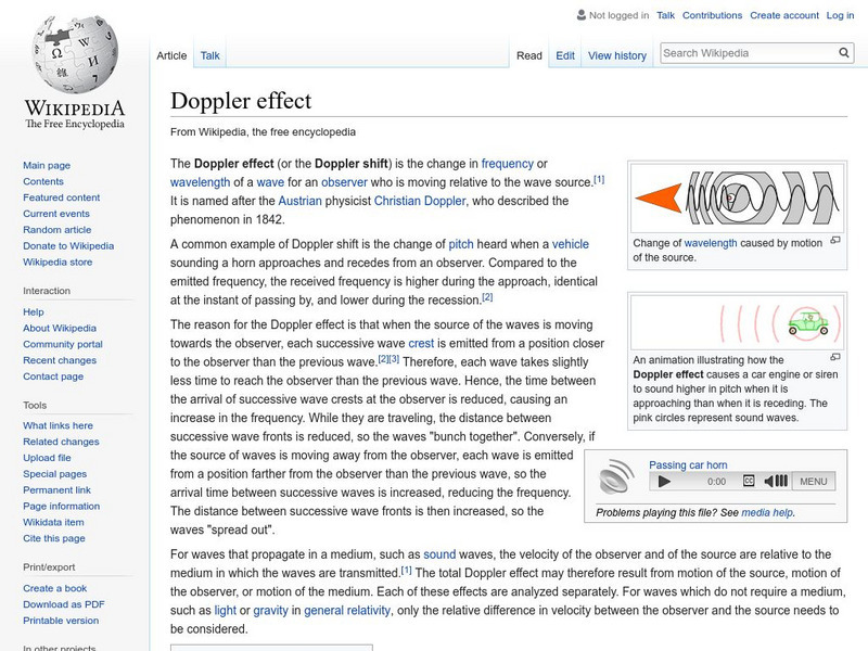 This Wikipedia article on the Doppler effect provides an explanation on what it is, information on the first analyzation, and its use in the field of astronomy and radar detection.