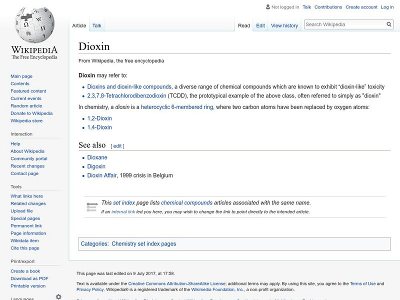 Use Wikipedia to explore dioxins. It gives the definition, as well as, sources, health effects, and exposure incidents.