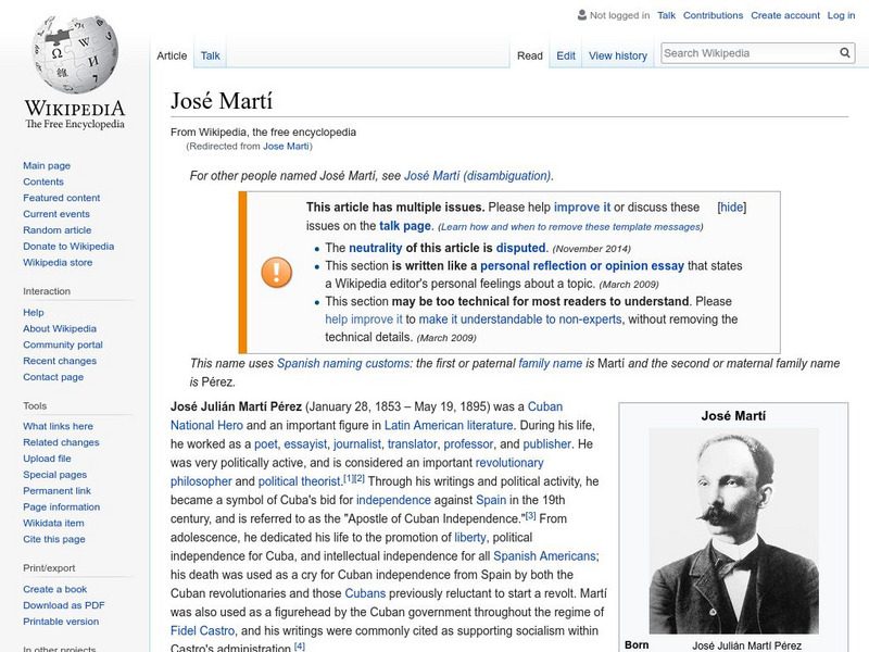 Biographical information on the life, work, and political significance of Jose Marti. Be sure to check out the external links to see sites on related topics and Wikipedia in Spanish.