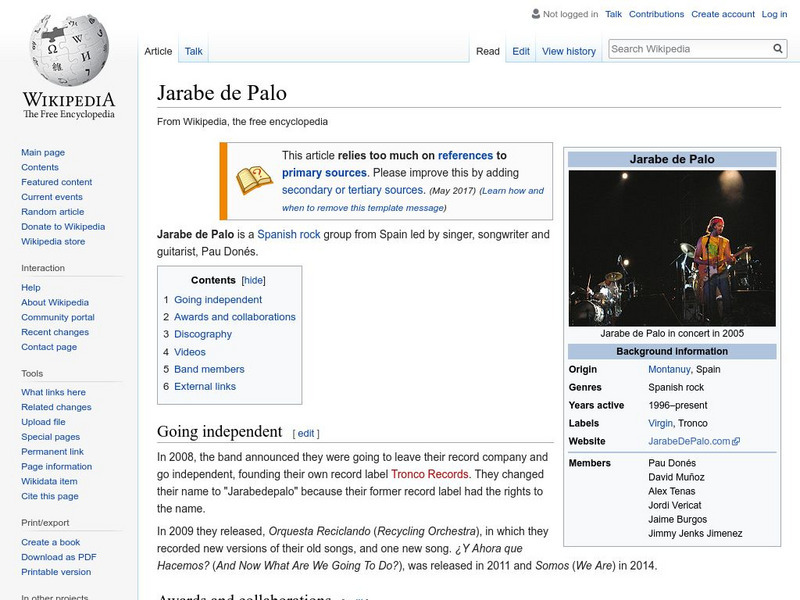 A biography and discography of the popular Spanish rock band, Jarabe de Palo. Includes a bit about the meaning of their name as well.