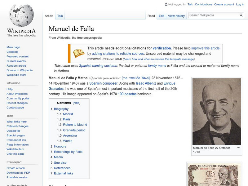 Basic biography and partial list of works by Spanish composer, Manuel de Falla.