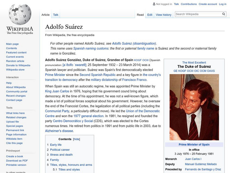A biography and information about the former Spanish prime minister, Adolfo Suarez.