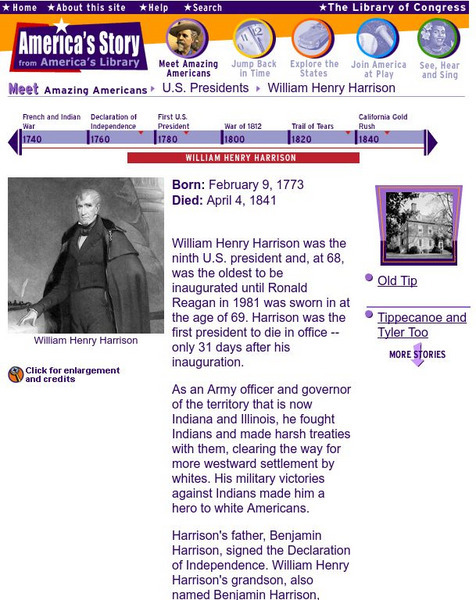 America's story gives a brief overview of the life of President William Henry Harrison. Contains portraits, and photos of actual documents from The Library of Congress' archives.