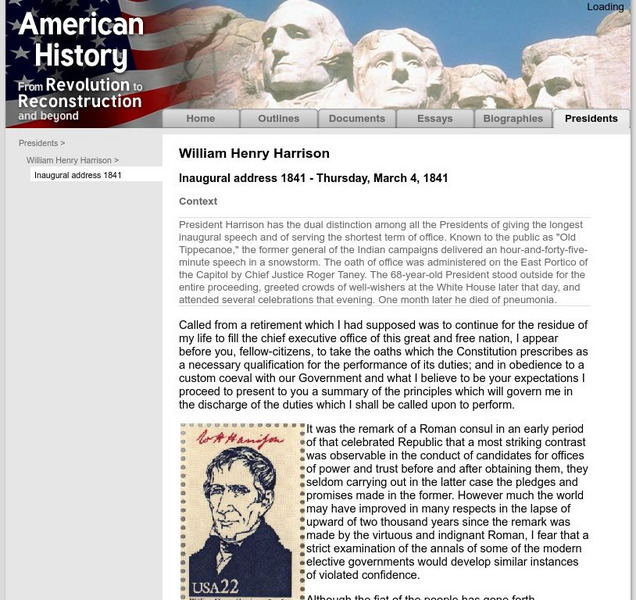 The original text of the Inaugural Address given by President Harrison in 1841 is provided at this site.