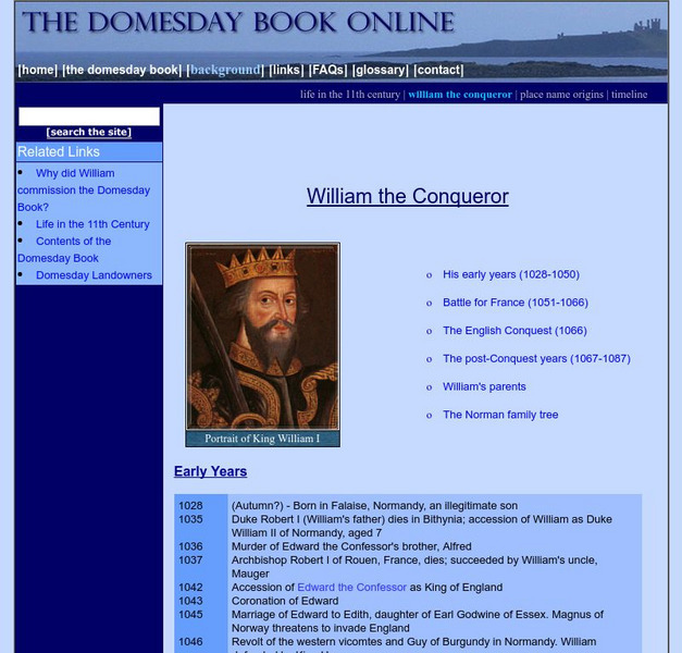 This site from the The Domesday Book provides a timeline on the life of William the Conqueror. Discusses his background, the Battle for France, the English Conquest, and his parents. There is also a Norman family tree at the end of the...