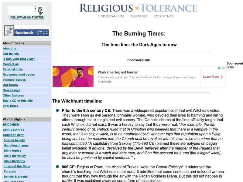 Religious Tolerance: The Burning Times: The Tiime Line: The Dark Ages to Now