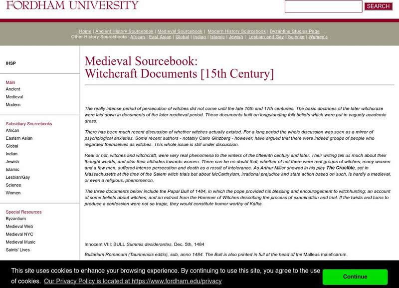 Fordham University offers three documents about witchcraft in the 15th Century. Included is a Papal bull where the Pope provides a blessing and encouragement to witch hunting.