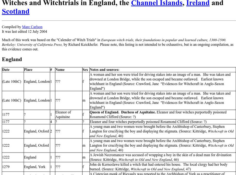 This website provides detailed information about witches and witchtrials in England. Site contains dates, locations, names, charge and sentence. Also provides sources.