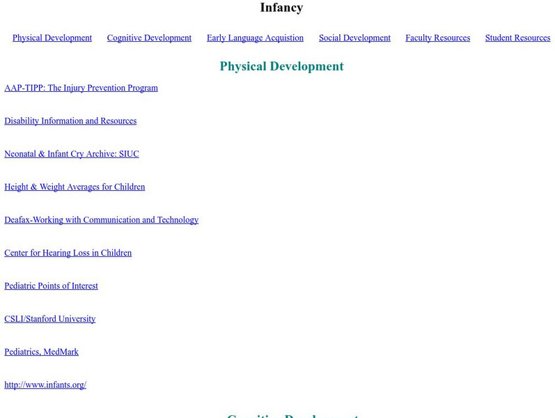 Click from here to lists of links on infancy, including physical, cognitive, social, and language development.