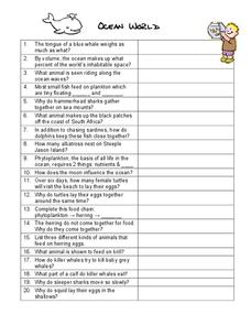 In this components of the ocean worksheet, students answer 20 questions about various species in the ocean such as plankton, different types of whales, sharks, and herring. Students also answer questions about the volume of water in the...