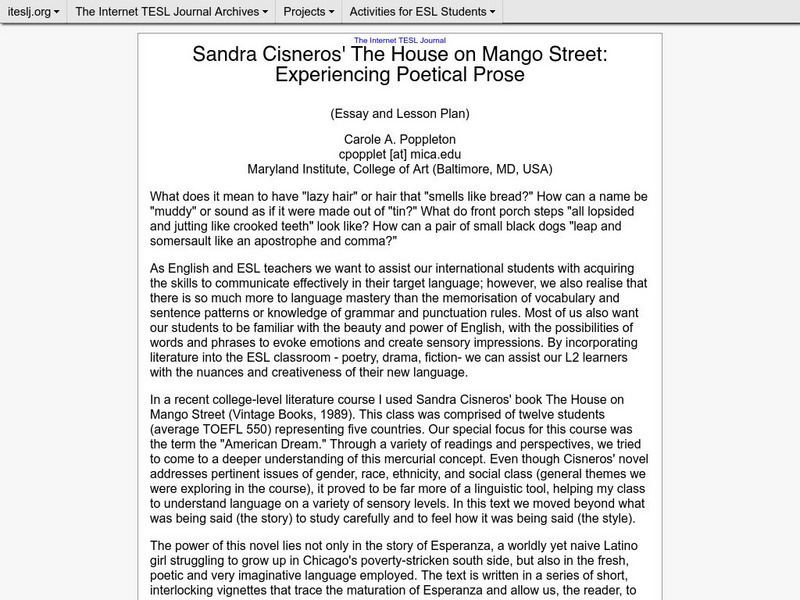 What do you know about poetical prose? Experience this type of writing when you read "The House on Mango Street" by Sandra Cisneros. This resource features wonderful interactive for all types of learners.