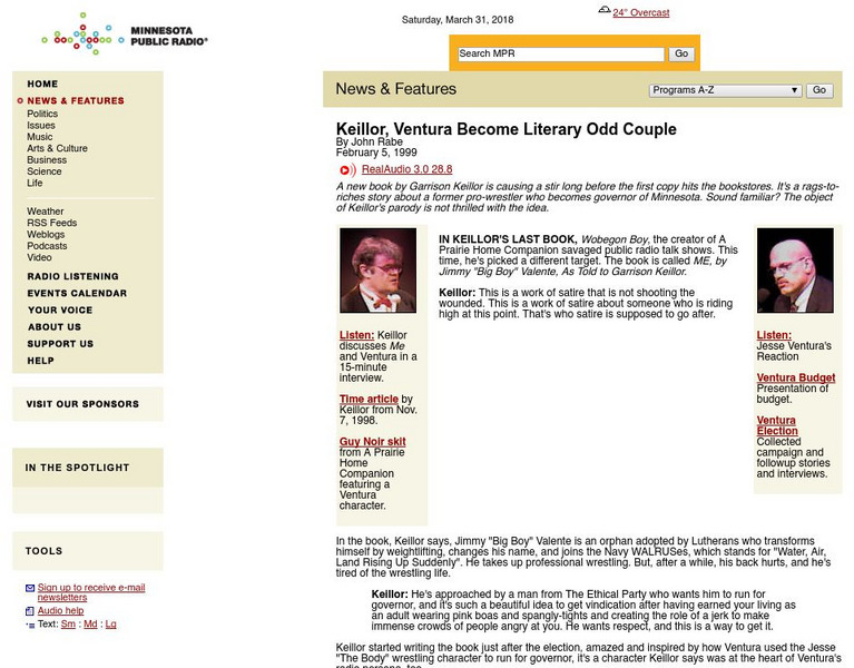This site from Minnesota Public Radio discusses Keillor's book that tells a story resembling the life and career of Gov. Jesse Ventura and includes numerous links to audio clips of Keillor discussing the book, Ventura's response,...