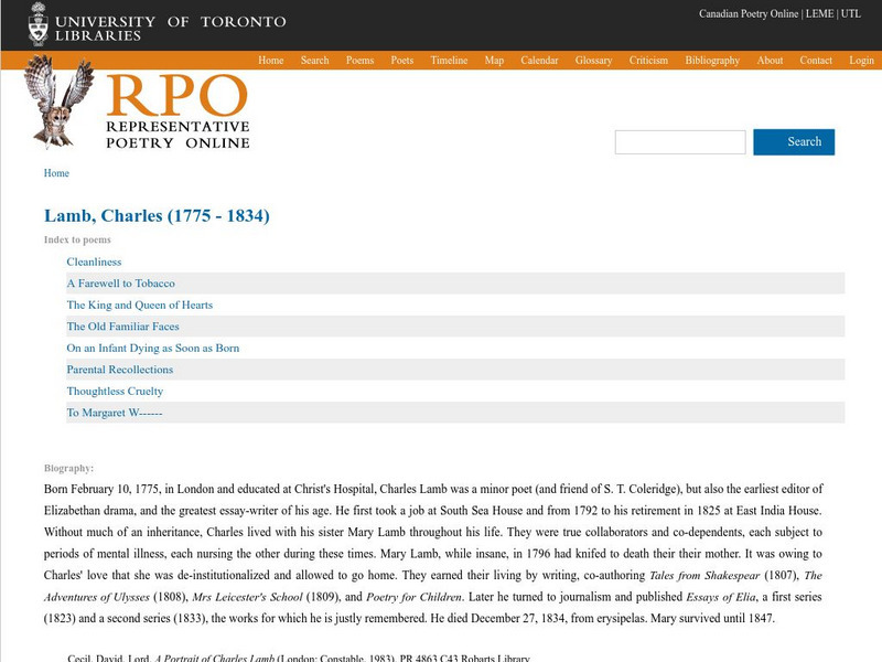 The University of Toronto offers selected poems of Chales Lamb, with notes on his life and works.