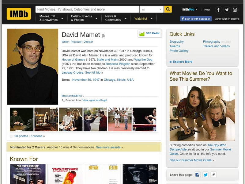 This resource provides an extensive filmography of Mamet. Mamet's credits are categorized into writer, director, producer, and actor, and each film credit serves as a link to more information.